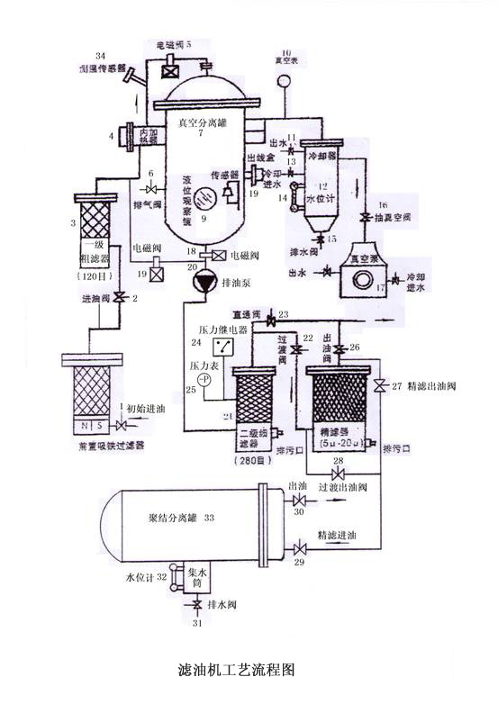 2、當(dāng)油液經(jīng) 數(shù)次 分離過濾后,從聚結(jié)分離罐(3),集水筒旁水位計(32)觀察,由排水閥排水,直到油箱內(nèi)被過濾的油水分排盡為止,對于要求較高的油可最后采用真空分離法,如下: